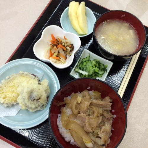 メニューは、豚丼、さつま芋と椎茸の天ぷら、きゃべつの塩昆布和え、味噌汁、漬物、りんごです!