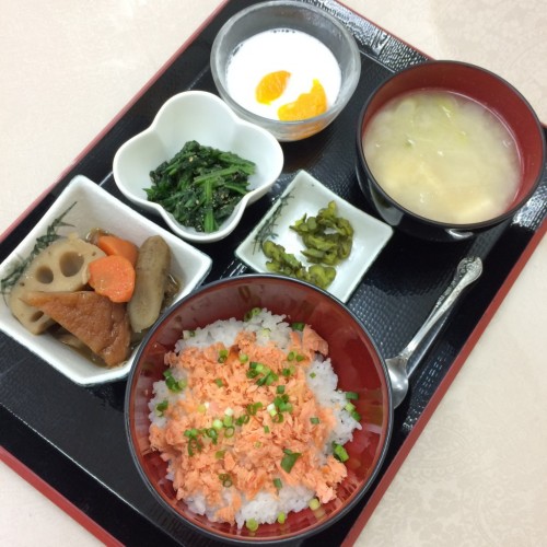 メニューは、鮭丼、根菜の煮物、ほうれん草の胡麻和え、味噌汁、漬物、牛乳寒です!