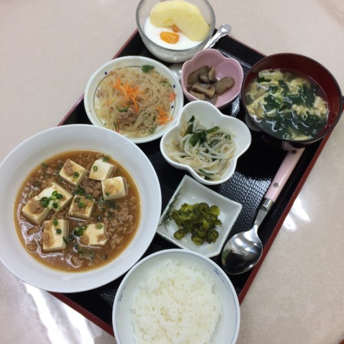 メニューは、マーボー豆腐、春雨の炒め物、もやしのナムル、ごはん、スープ、漬物、ヨーグルトです!