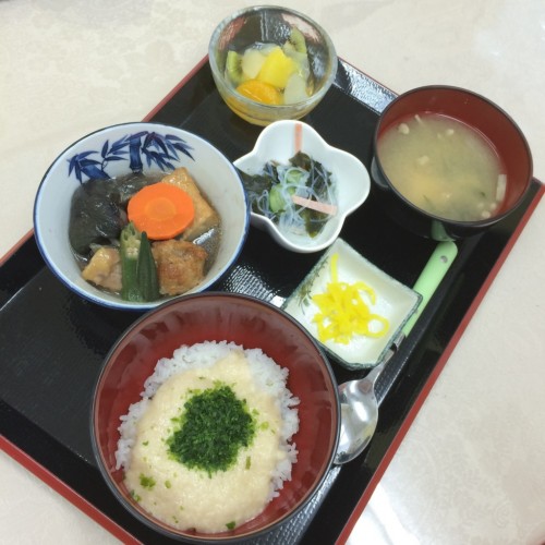 メニューは、とろろ丼、なすの煮びたし、春雨とわかめの酢の物、味噌汁、漬物、フルーツミックスです!