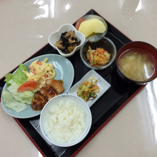 メニューは、鶏の照り焼き、ひじきとレンコンの煮物、白菜のおかか和え、ごはん、味噌汁、漬物、りんごです!