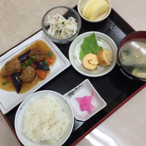 メニューは、肉団子の和風餡かけ、だて巻き、大根サラダ、ごはん、味噌汁、漬物、りんごです!