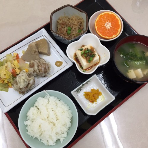 メニューは、シューマイ、春雨の炒め物、里芋の煮物、蒸し野菜、中華風冷奴、ごはん、味噌汁、漬物、みかんです!