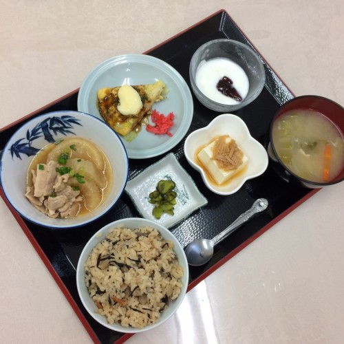 メニューは、ひじきごはん、大根と豚肉の煮物、玉子ときゃべつの炒め物、冷奴、味噌汁、漬物、ヨーグルトです!