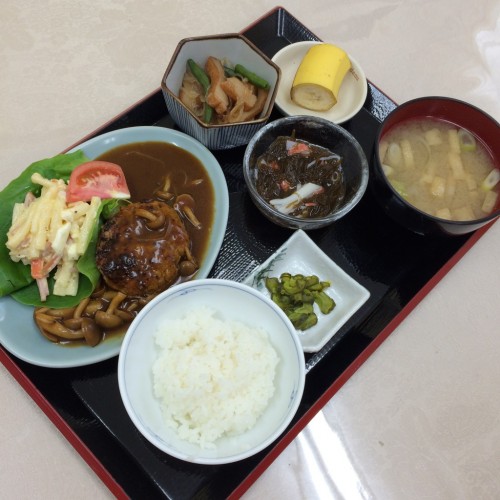 メニューは、煮込みハンバーグ、さつま揚げの煮物、もずく酢、ごはん、味噌汁、漬物、バナナです!