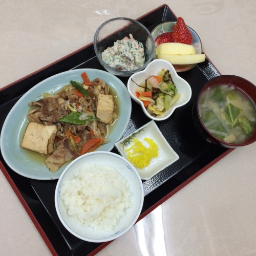 メニューは、すきやき風煮物、野菜の白和え、きゃべつの塩昆布和え、ごはん、味噌汁、漬物、フルーツです!