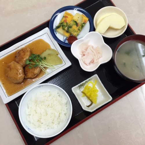 メニューは、鶏つくね、野菜入り玉子焼き、カブの梅酢和え、ごはん、味噌汁、漬物、りんごです!