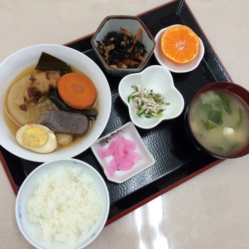 メニューは、おでん、ひじきの煮物、きゅうりと鶏肉の梅肉和え、ごはん、味噌汁、漬物、みかんです!