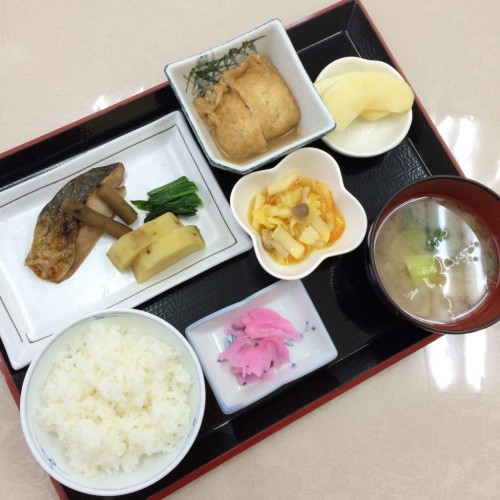 メニューは、焼き魚、油揚げの巾着煮、白菜の和え物、ごはん、味噌汁、漬物、りんごです!