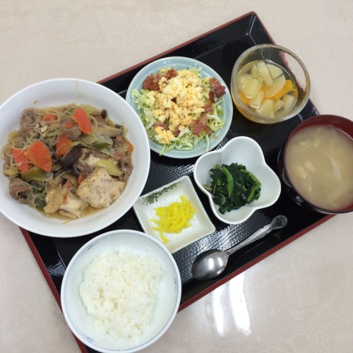 メニューは、肉豆腐、ミモレサラダ、ほうれん草のなめたけ和え、ごはん、味噌汁、漬物、フルーツミックスです!