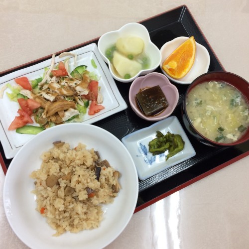 メニューは、混ぜご飯、バンバンジー、じゃが芋の煮物、海藻寒天、味噌汁、漬物、オレンジです!