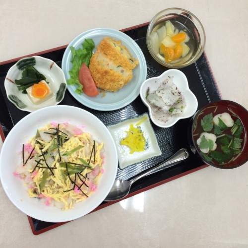 2016/3/3 2016.03.03 昼食 本日の昼食です!ひなまつりメニューになっています♪ メニューは、ちらし寿司、菜の花コロッケ、かぶのゆかり和え、高野豆腐の煮物、すまし汁、漬物、フルーツミックスです!