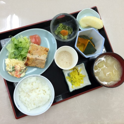 メニューは、松風焼、かぼちゃの煮物、ブロッコリーのごま酢和え、ごはん、味噌汁、漬物、りんご、甘酒です!