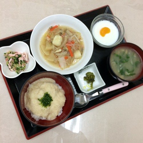 メニューは、とろろ丼、大根の海鮮餡かけ、きゅうりとささみの梅肉和え、味噌汁、漬物、牛乳寒天です!
