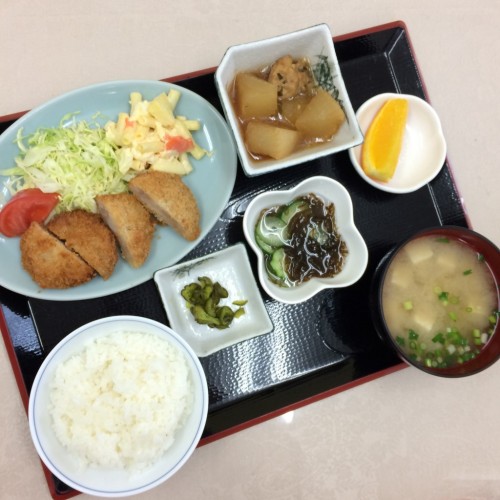 メニューは、とんかつ、大根の煮物、もずく酢、ごはん、味噌汁、漬物、オレンジです!