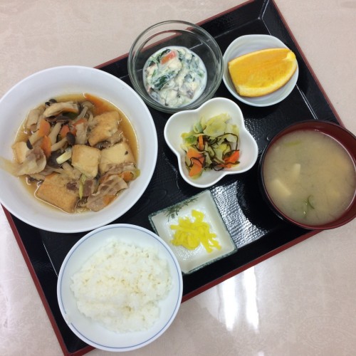 メニューは、すきやき風煮物、野菜の白和え、キャベツの塩昆布和え、ごはん、味噌汁、漬物、オレンジです!