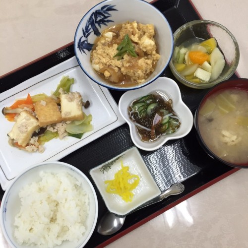 メニューは、親子煮、絹厚揚げの炒め物、もずく酢、ごはん、味噌汁、漬物、フルーツミックスです!