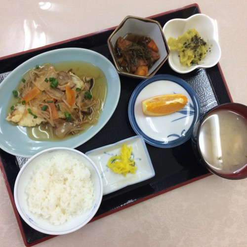 メニューは、たらの甘酢餡かけ、切り昆布の煮物、芋きんとん、ごはん、味噌汁、漬物、オレンジです!