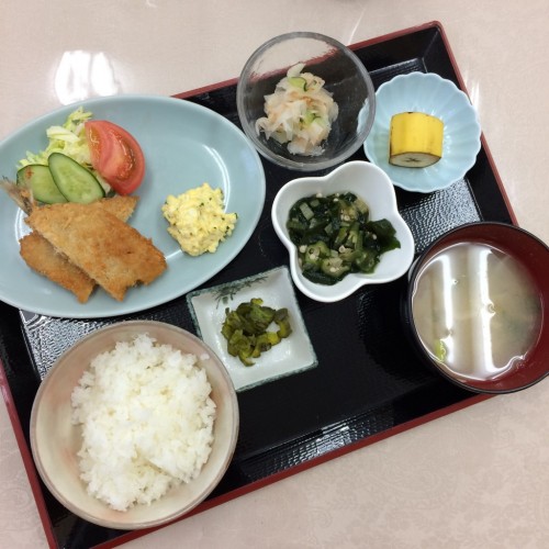 メニューは、アジフライ、オクラとわかめの煮浸し、大根サラダ、ごはん、味噌汁、漬物、バナナです!