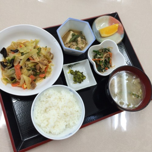 メニューは、スタミナ炒め、焼豆腐の煮物、ほうれん草の煮浸し、ごはん、味噌汁、漬物、オレンジです!