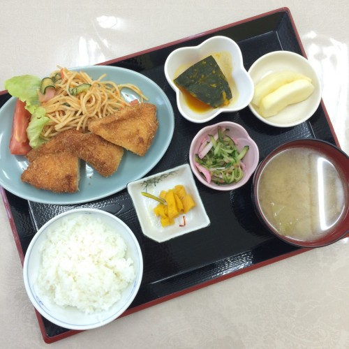 メニューは、ハンペンのはさみ揚げ、かぼちゃの煮物、きゅうりとかまぼこの梅和え、ごはん、味噌汁、漬物、りんごです!