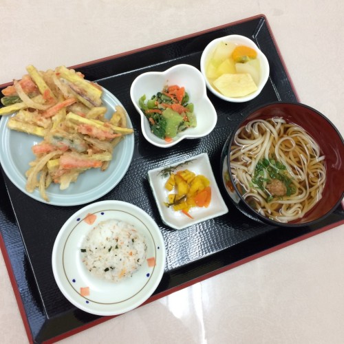 メニューは、梅うどん、かき揚げ天、チンゲン菜の胡麻和え、ミニおにぎり、漬物、フルーツミックスです!