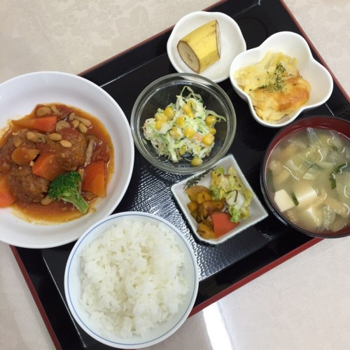 メニューは、肉団子のトマト煮、マカロニのチーズ焼き、コールスローサラダ、ごはん、味噌汁、漬物、バナナです!