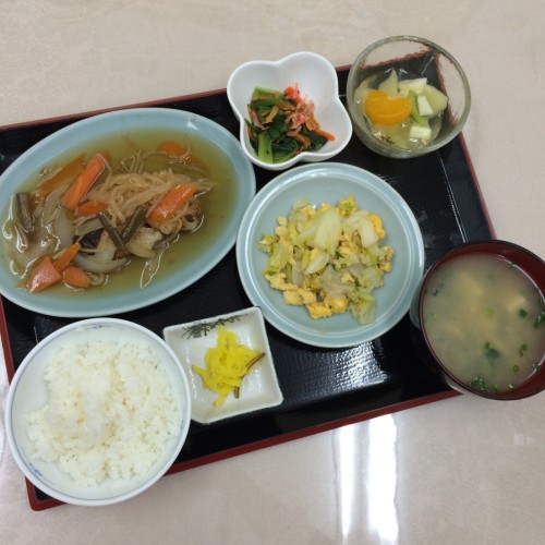 メニューは、たらの甘酢餡かけ、キャベツの卵炒め、小松菜の和え物、ごはん、味噌汁、漬物、フルーツミックスです!