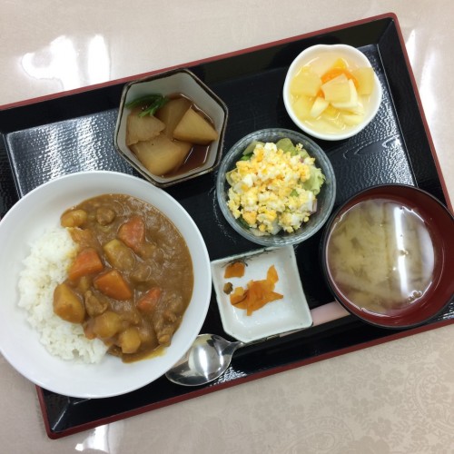 メニューは、カレーライス、大根の煮物、卵サラダ、味噌汁、漬物、フルーツミックスです!