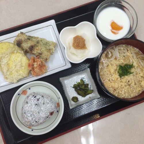 メニューは、卵うどん、ちくわの磯辺揚げ、野菜天、大根のなめたけ和え、ミニおにぎり、漬物、ヨーグルトです!