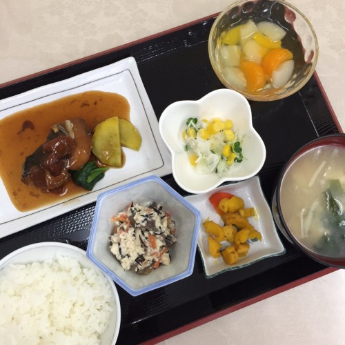 メニューは、あじの梅煮、こんにゃくの白和え、大根サラダ、ごはん、味噌汁、漬物、フルーツミックスです!
