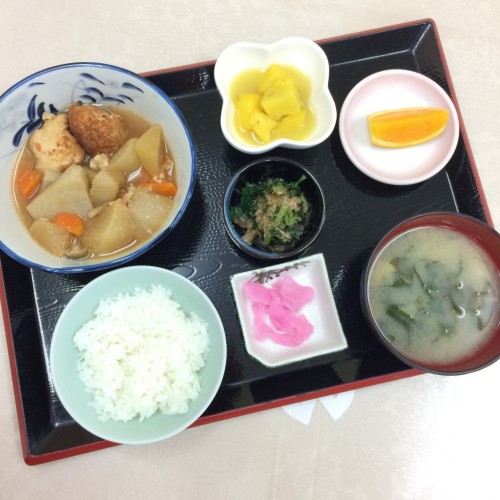 メニューは、豆腐つくねの煮物、ホタテの和え物、さつま芋の甘煮、ごはん、味噌汁、漬物、オレンジです!