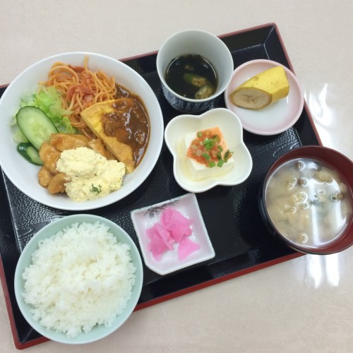 メニューは、チキン南蛮、オクラとわかめの煮びたし、冷奴、ごはん、味噌汁、漬物、バナナです!