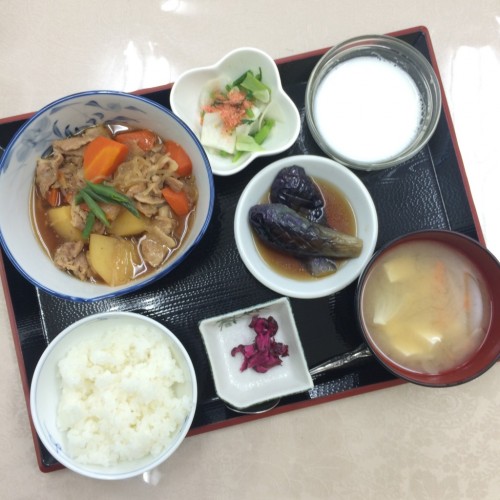 メニューは、肉じゃが、なすの煮びたし、かぶの柚子胡椒和え、ごはん、味噌汁、漬物、牛乳寒天です!