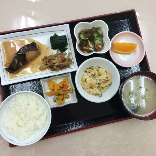 メニューは、カレイの煮付け、炒り豆腐、もずく酢、ごはん、味噌汁、漬物、オレンジです!