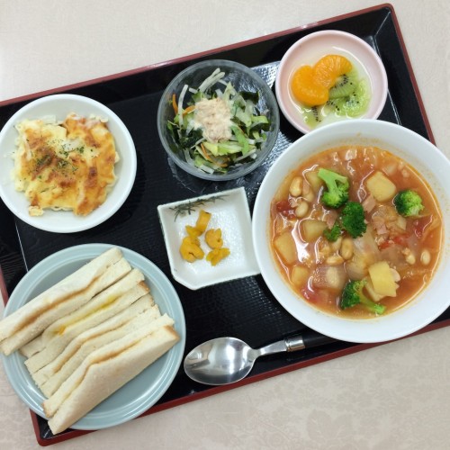 メニューは、トマトスープ煮、グラタン、野菜サラダ、サンドウィッチ、漬物、フルーツミックスです!