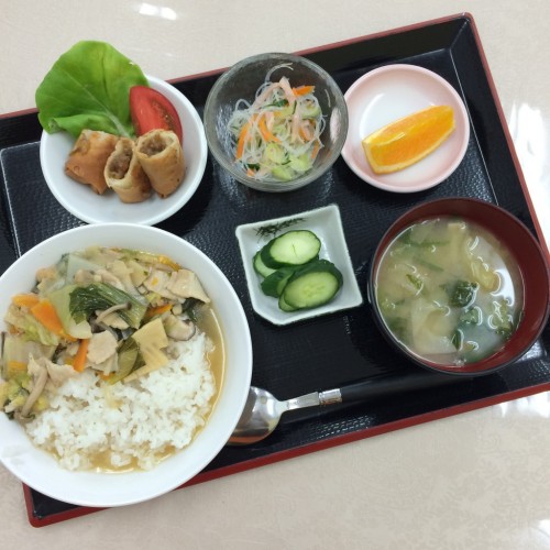 メニューは、中華丼、春巻き、春雨の中華サラダ、味噌汁、漬物、オレンジです!