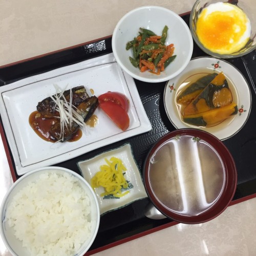 メニューは、さんまの蒲焼き、かぼちゃの煮物、いんげんの胡麻和え、ごはん、味噌汁、漬物、ヨーグルトです!