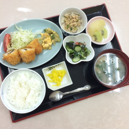 メニューは、鶏肉梅しそロール揚げ、茶碗蒸し、きゅうりとわかめの酢の物、ごはん、味噌汁、漬物、フルーツミックスです!