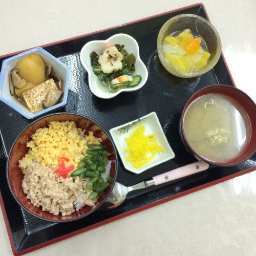 メニューは、三色丼、焼豆腐の煮物、きゅうりとわかめの胡麻酢和え、味噌汁、漬物、フルーツミックスです!