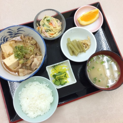 メニューは、肉豆腐、ふきの煮物、スパゲッティサラダ、ごはん、味噌汁、漬物、オレンジです!