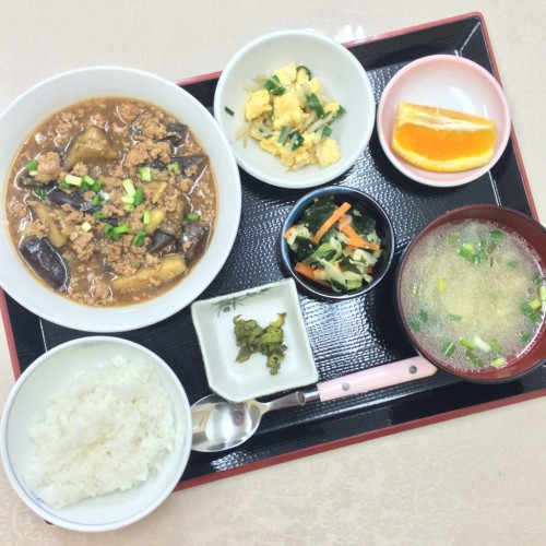 メニューは、マーボーなす、ニラ玉、わかめのナムル、ごはん、味噌汁、漬物、オレンジです!