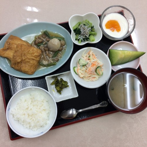 メニューは、油揚げの巾着煮、春雨サラダ、小松菜のしらす和え、ごはん、味噌汁、漬物、ヨーグルト、メロンです!