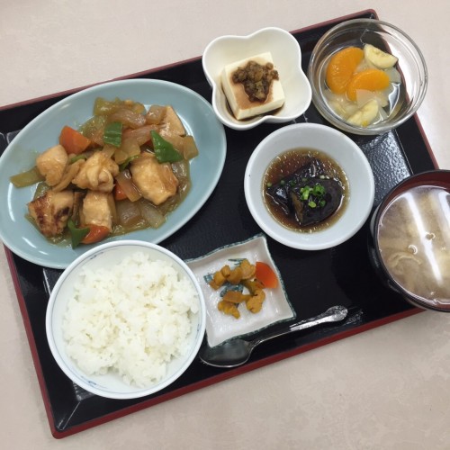 メニューは、酢鶏、なすの煮びたし、中華風冷奴、ごはん、味噌汁、漬物、フルーツミックスです!