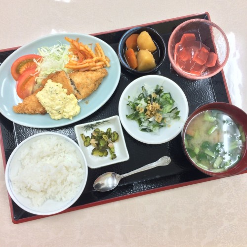 メニューは、白身魚のフライ、じゃが芋の煮物、わかめと玉ねぎの和え物、ごはん、味噌汁、漬物、アセロラゼリーです!