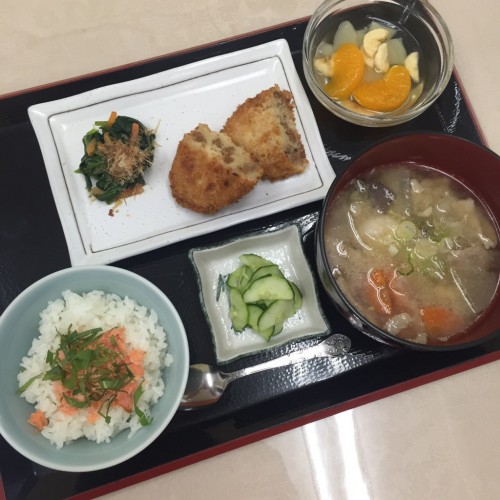 メニューは、豚汁、コロッケ、ほうれん草のお浸し、ミニ鮭丼、漬物、フルーツミックスです!