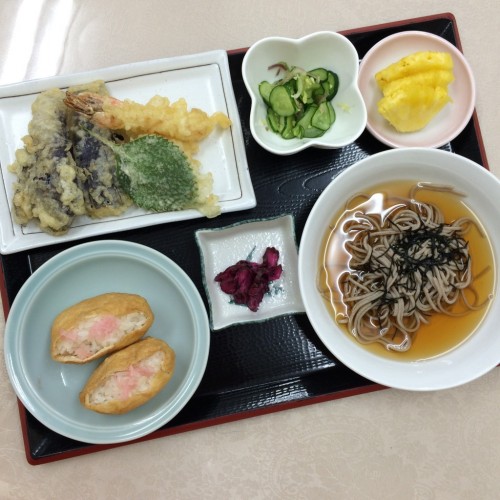 メニューは、冷やしそば、天ぷら、きゅうりとミョウガの和え物、いなり寿司、漬物、パイナップルです!