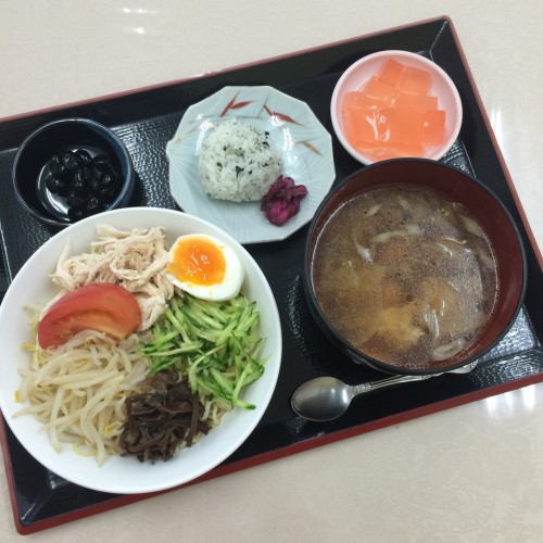 メニューは、冷やし中華、煮豆、けんちん汁、ミニおにぎり、漬物、アセロラゼリーです!