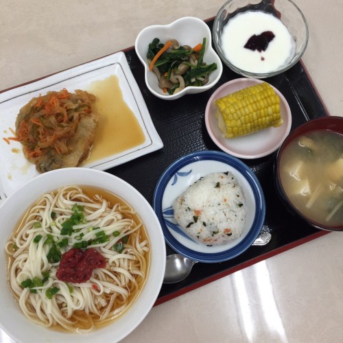 メニューは、梅うどん、アジの南蛮漬け、ほうれん草のお浸し、ミニおにぎり、とうもろこし、ヨーグルトです!