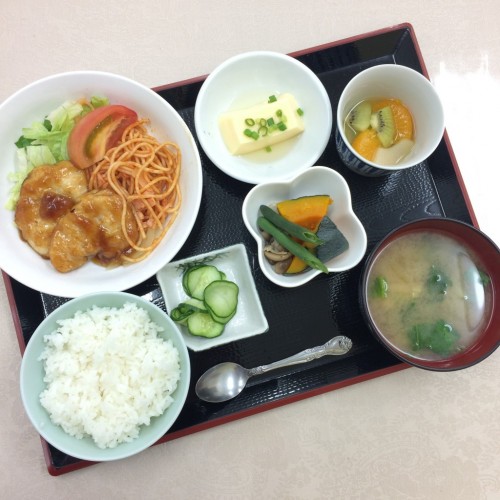 メニューは、鶏の照り焼き、蒸し野菜、玉子豆腐、ごはん、味噌汁、漬物、フルーツミックスです!